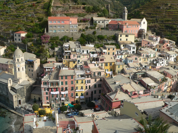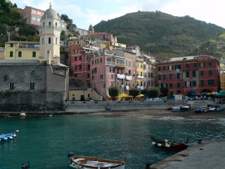 Vernazza is just five minutes by train from Monterosso, or several hours by mountain trekking. In the pictures, the small dock with "Santa Margherita di Antiochia" church, and a view from the top.